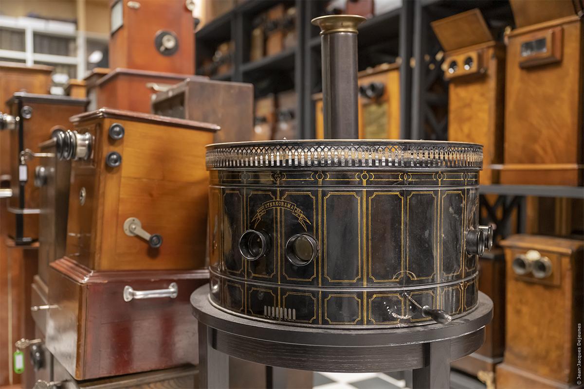 Le Kaiser-Panorama Rodenstock, inventé par August Fuhrmann en 1880 pouvait accueillir 25 personnes à la fois pour voir des plaques verre stéréoscopiques en rotation. Ce modèle Miniature Table Kaiser-Panorama est apparu au catalogue Rodenstock en 1888 et permet à 4 personnes de voir les images stéréoscopiques à la fois.