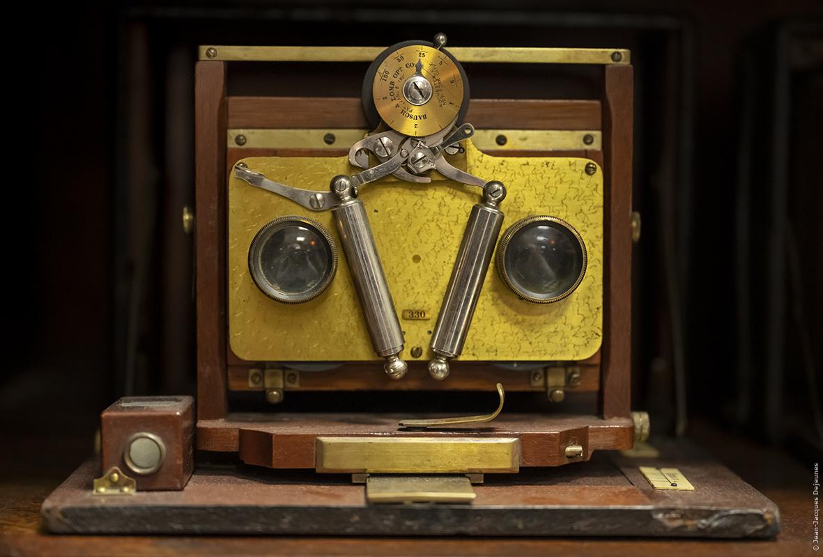 Cette folding camera a été réalisée par Rochester Optical Stereocamera aux USA entre 1892 et 1899. Cet appareil stéréoscopique utilise des demi plaques 5 x 7 pouces et est équipé de deux optiques fabriquées par Bausch & Lomb qui ont conçu, en 1891, un obturateur central à iris. Les lamelles disposées entre les lentilles étaient ouvertes et refermées par commande pneumatique. Les vitesses synchronisées vont jusqu'à 1/100ème de seconde. La Compagnie a été rachetée en 1903 par Eastman Kodak.
