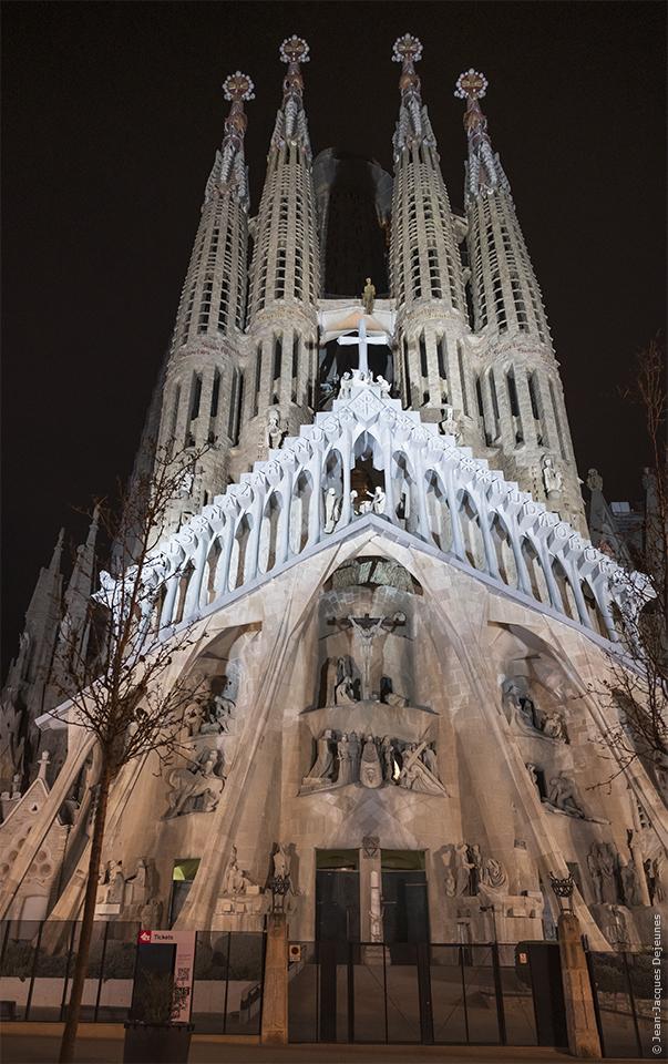 Vue générale de nuit de la façade de la Passion avec son porche fait de six colonnes ressemblant à des os inclinés vers l'intérieur.