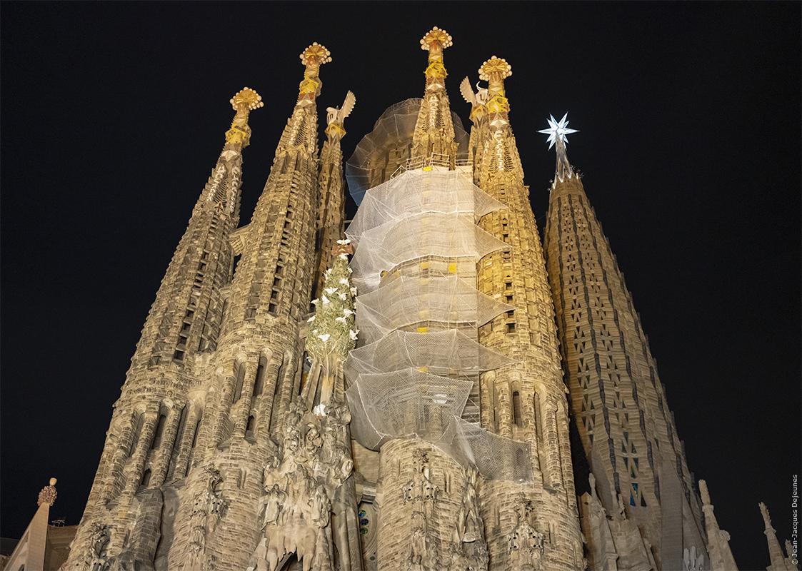 Le cyprès en céramique porte des colombes en couleurs. Il a été conçu par Gaudí et réalisé par Domenec Sugrañes.