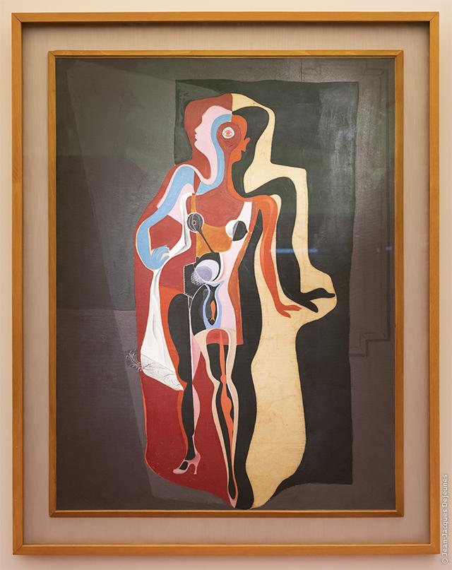 Le mannequin, représenté comme marchant dans un couloir, les bras tendus, crée un sens intrigant du mouvement et de la profondeur. Les multiples membres du mannequin ajoutent à l'élément surréaliste en faisant une image fascinante qui défie la perception du spectateur. L'utilisation de l'huile sur toile par Dalí permet d'obtenir de riches couleurs et textures, améliorant ainsi l'impact visuel global. Plusieurs silhouettes sont emboîtées sur fond noir. Presque cubiste.