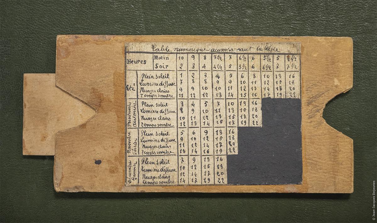 Au dos de cette Règle de temps de pose figure une Table numérique des temps de pose selon les heures de la journée, selon les saisons et l'ensoleillement du moment, ancêtre de ce que l'on retrouvera sur les notices qui accompagneront les films monochrome et couleur quelques années plus tard.