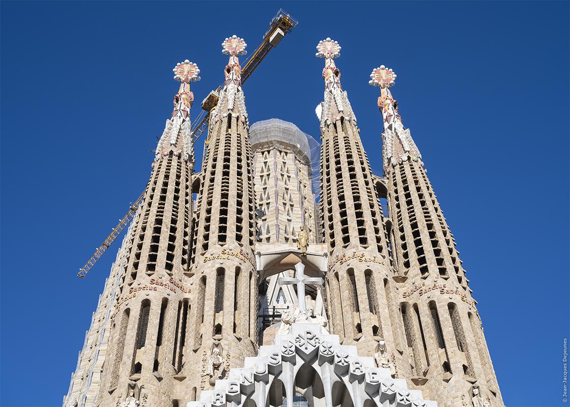Une fois achevée, la basilique compte dix-huit tours ayant un profil parabolique et disposant d'escaliers hélicoïdaux. Les campaniles de la façade de la Passion ont été achevés en 1976. Les quatre tours sont dédiées à saint Jacques le Mineur, saint Barthélémy, saint Thomas et saint Philippe. Les statues des saints sont installées au tiers de la hauteur des tours correspondantes. Les deux tours centrales mesurent 112 mètres, les deux autres culminent à 107 mètres.