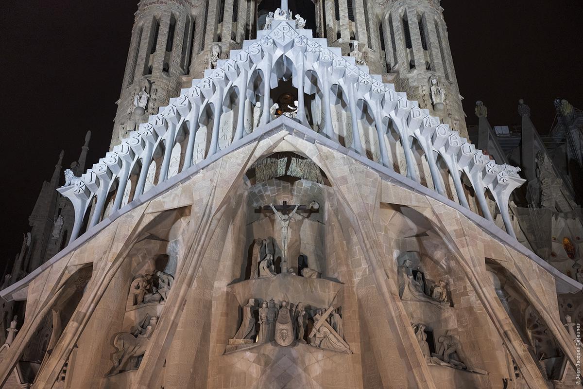 Vue de nuit sur la façade de la Passion décorée par Josep Maria Subirachs.