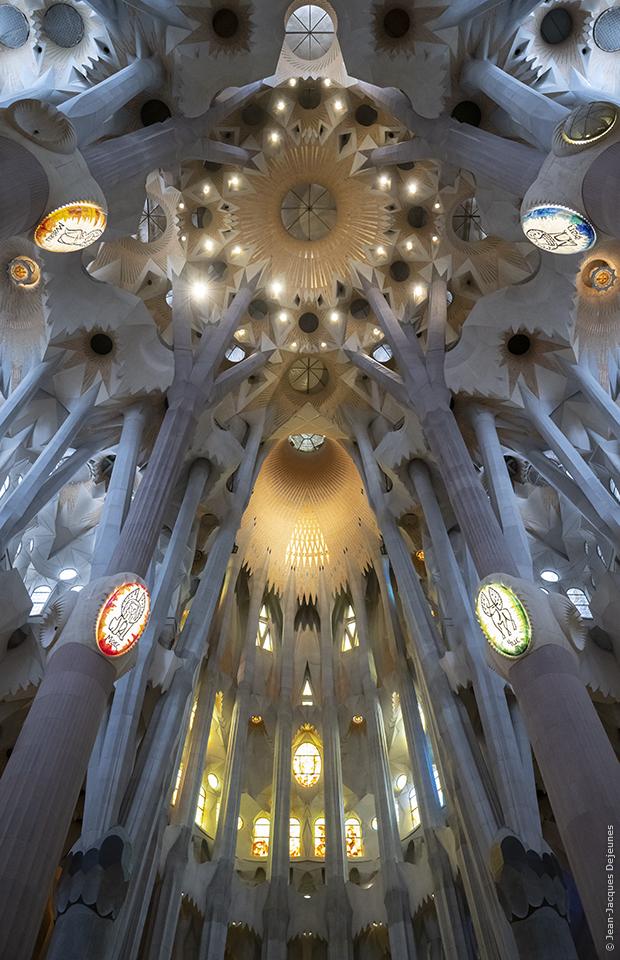 Les colonnes de la croisée de transept sont dédiées aux évangélistes saint Matthieu et saint Jean en haut de l'image et saint Marc et saint Luc en-dessous dont les emblèmes lumineux ont été installés sur les chapiteaux.