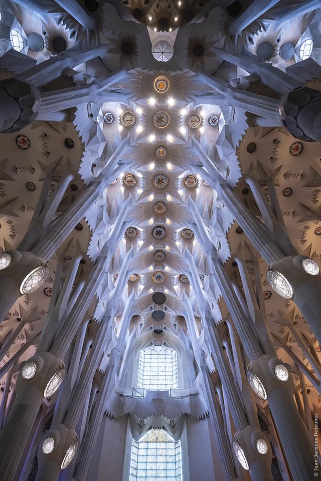 La vue est prise en direction de la verrière de la façade de la Gloire. Les nefs centrales du temple, couvertes de clefs de voûte perforées de forme hyperboloïde pour permettre l'arrivée de la chaleur naturelle, sont achevées en 1993 par l'architecte Jordi Bonet et Armengo.