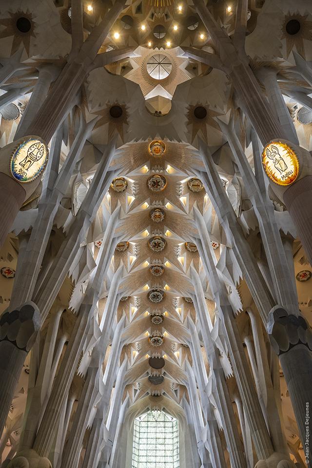 Les voûtes de la nef centrale de la croisée de transept vers la façade de la Gloire sous un éclairage du midi.