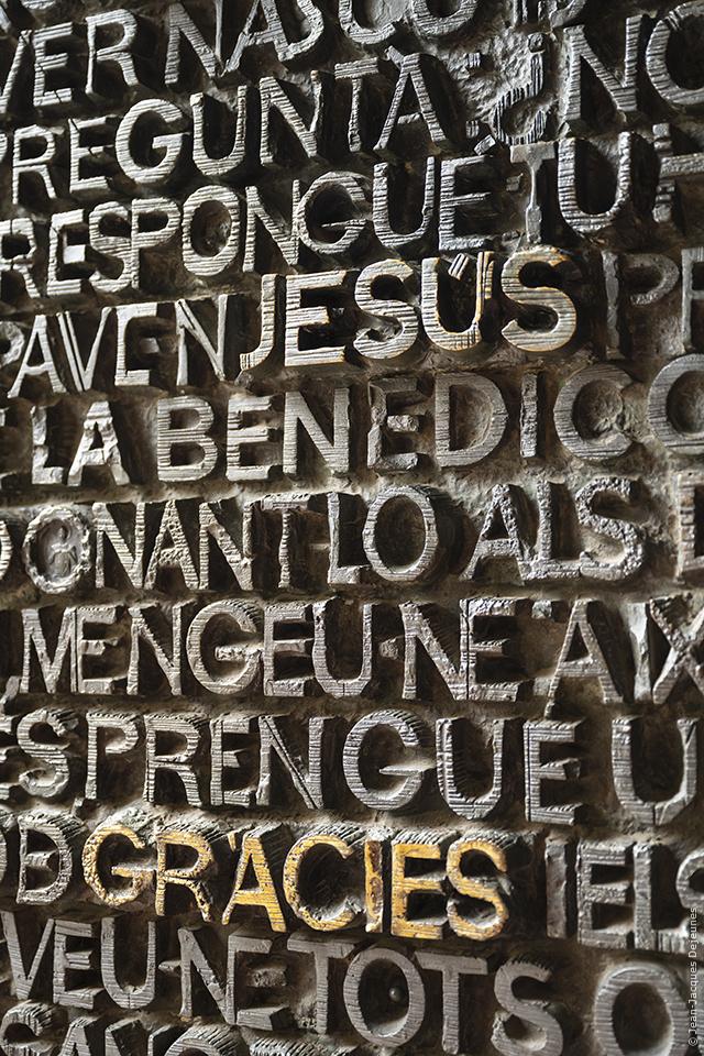 Sur les deux portes en bronze du portail de la Charité, des lettres en relief se détachent, des paroles ou des phrases dorées telles que la question de Ponce Pilate : "Qu'est-ce que la vérité ?" À l'avant du portail se dresse une colonne représentant la flagellation du Christ, élevée sur trois marches symbolisant les trois jours précédant la Résurrection.