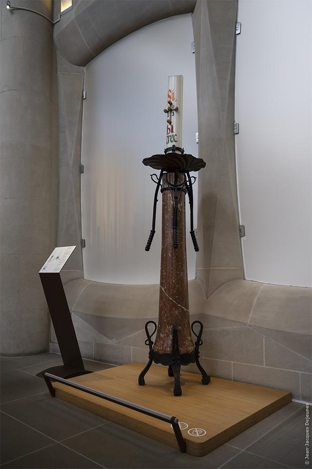 Ce candélabre pour de grandes et grosses bougies de pilier provient de la crypte de la Sagrada Família. Il a été fabriqué en 1883 à partir de pierre, de fer, de laiton et de bois. Composé de deux parties, une base fixe et un bougeoir portable, il était utilisé principalement pendant les fêtes de Pâques durant les processions liturgiques.