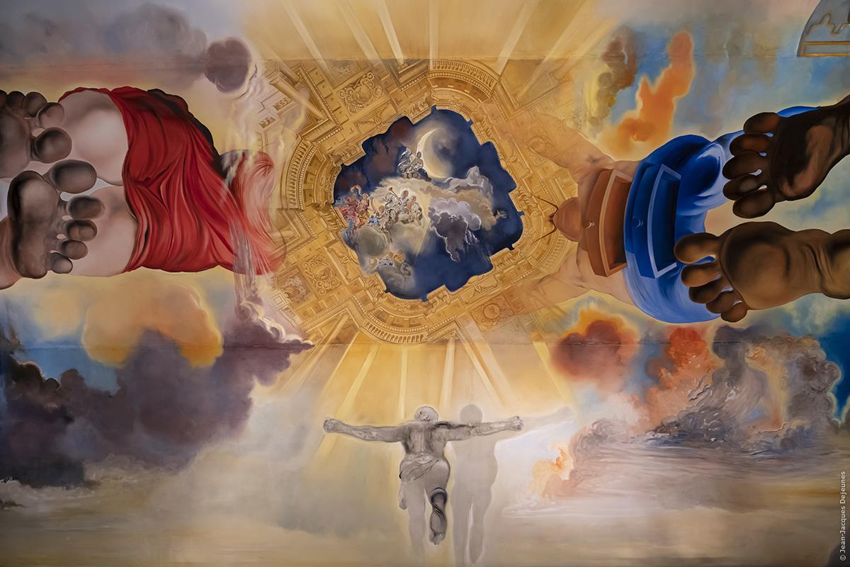 "Plafond Central du Toit du Palais du Vent". Il s'agit d'une peinture que Dalí exécuta dans son atelier de Port Lligat, même s'il l'achèvera sur un énorme échafaudage après que les cinq toiles aient été placées au plafond. Cette œuvre de près de six mètres de long représente Salvador Dalí et sa muse Gala dans une perspective originale. Elle fait référence à la Tramontane et aux étapes majeures de la vie du maître. C'est dans cette salle, salon de repos de l'ancien Théâtre Municipal de Figueras, que, pour la première fois, Dalí avait exposé ses travaux en 1919. Il explique que cette œuvre est un paradoxe, que lorsque le visiteur regarde vers le haut, il ne voit que des nuages, mais qu'en réalité c'est un coup d'effet théâtral car, au lieu du ciel on voit la terre, et au lieu de la terre, on voit la mer. Dans la partie centrale, un raccourci de Gala et Dalí qui versent une pluie d'or sur Figueras et l'Ampourdan.