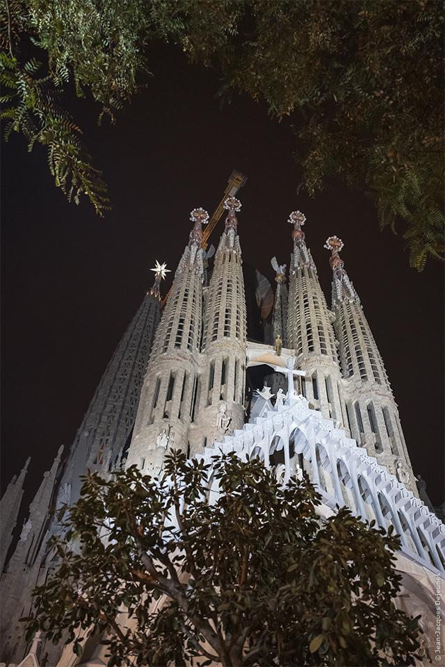 Vue de nuit à travers les arbres de la place de la Sagrada Família.